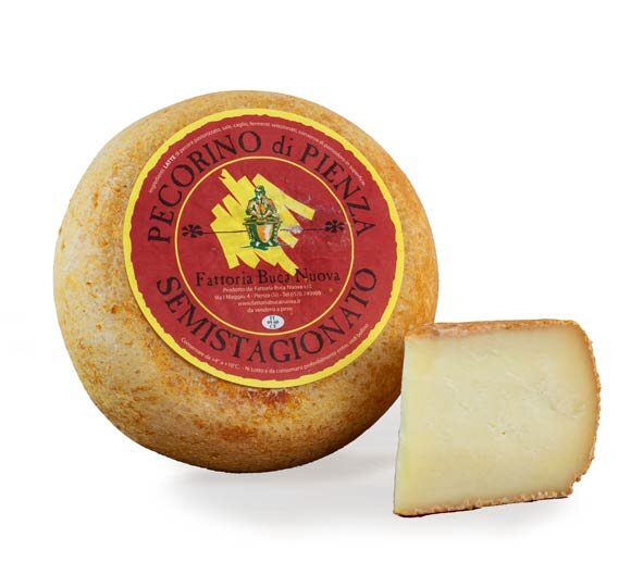 - Appearance: Pecorino di Pienza Rosso typically has a reddish or orange rind due to the washing process. The interior of the cheese is a pale yellow to golden color, with a firm, smooth texture that may become more granular with age.