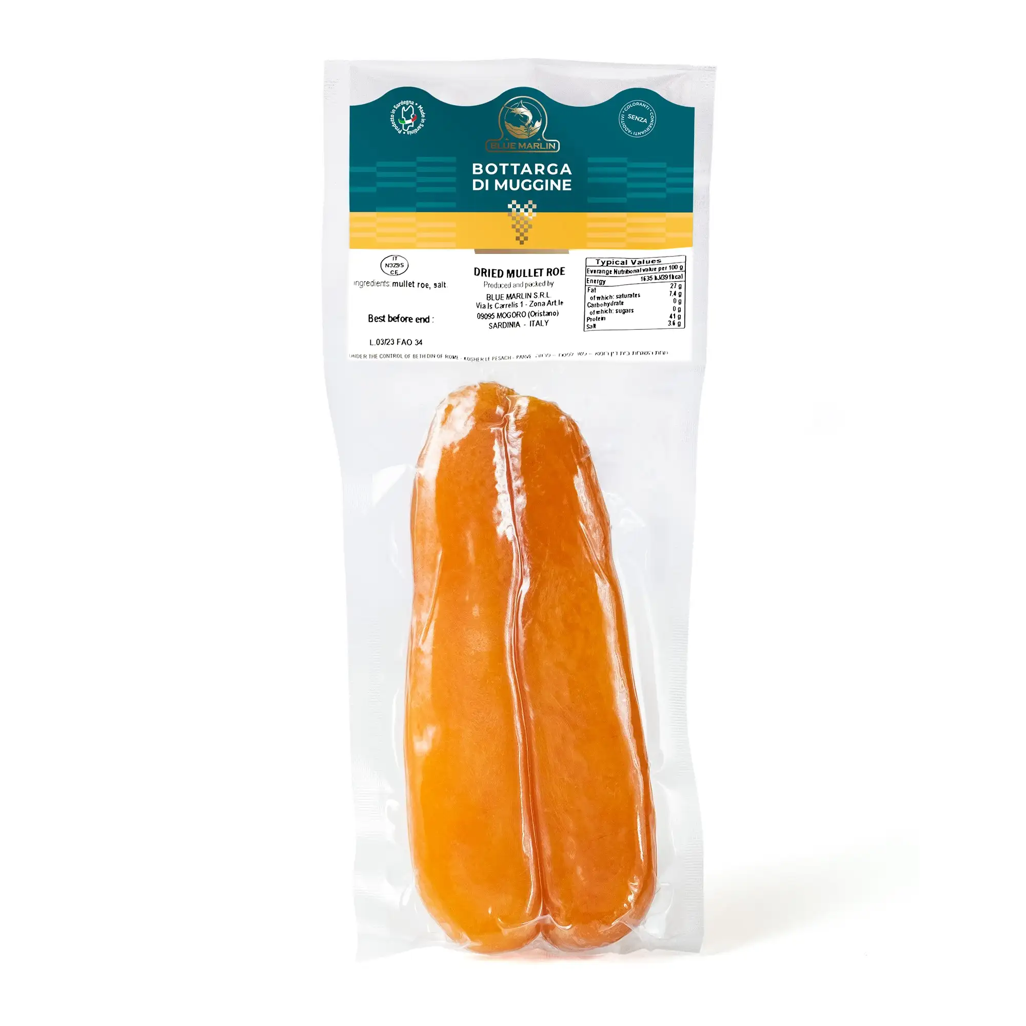 It is from the thousands of eggs produced by each female mullet that gives birth to Bottarga, one of the most delicious gastronomic delicacies of Sardinia. Salted, compressed and dried eggs. Although Bottarga is also produced in other parts of the world, it is undoubtedly the Sardinian one that excels in terms of reputation and quality. With its characteristic amber colour and delicate but decisive sea flavour, it is produced and packaged following a careful and rigorous check of the seasoning phases. To maintain the integrity of the product as much as possible, it is stored in a vacuum bag.