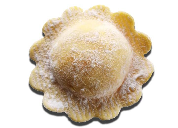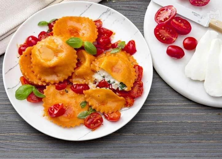 Ingredients: Pasta 44%: soft WHEAT flour type “00”, durum WHEAT semolina, EGGS 20%, water. If red: with addition of 1% dehydrated tomato. Filling 56%: cow’s milk ricotta (whey, MILK, lactic acid), mozzarella 28% (pasteurized MILK, salt, rennet, acidity regulator: citric acid), tomato 28%, cheeses (containing MILK), potatoes, flavourings, potato starch, vegetable fibre, basil 0.7%. Sprinkle with rice cream. May contain traces of NUTS, CELERY, SOY, SULPHITES, FISH.