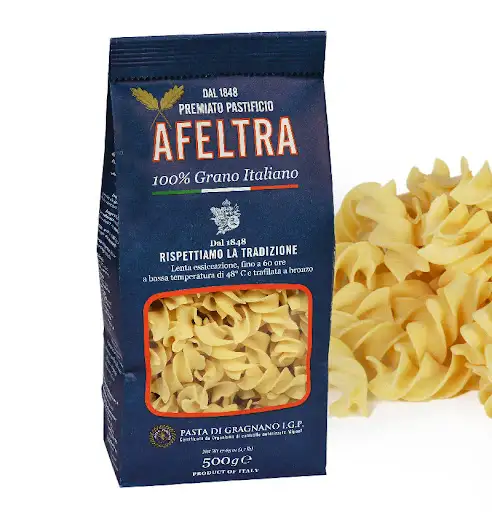 Fusilloni Afeltra is a premium pasta made by Pastificio Afeltra, an artisanal pasta producer from Gragnano, Italy, which is known as the birthplace of Italian dry pasta. Afeltra’s fusilloni are large, corkscrew-shaped pasta made from 100% Italian durum wheat semolina and formed using bronze dies. This traditional technique gives the pasta a rough texture, ideal for absorbing sauces.
